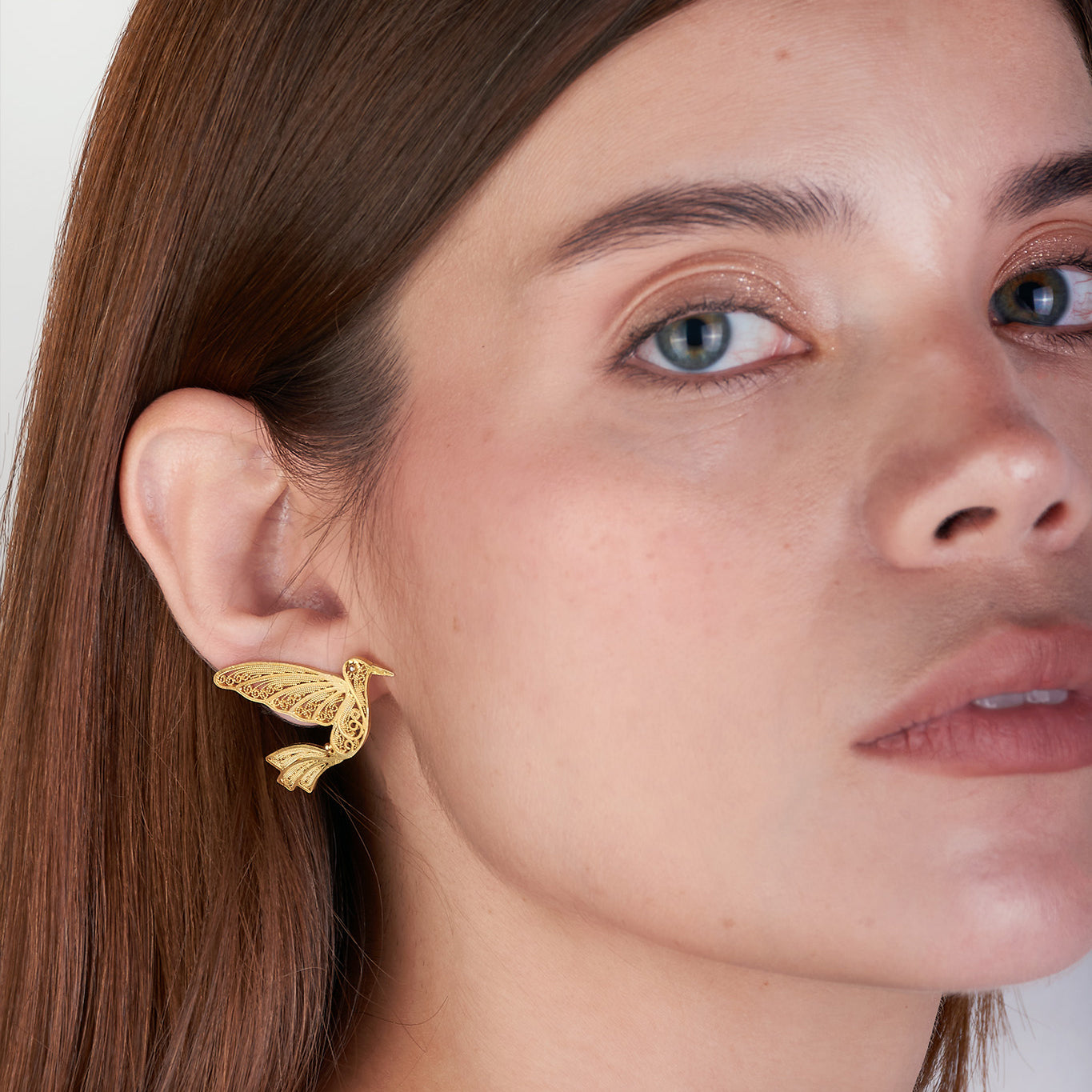 Aretes en forma de colibrí en filigrana, elaborados en plata 980 con baño en oro de 24K, una pieza delicada que resalta por su nivel de detalle y ligereza. Su diseño artesanal combina elegancia y simbolismo, creando un estilo sofisticado y lleno de encanto para ideal para elevar cualquier look.