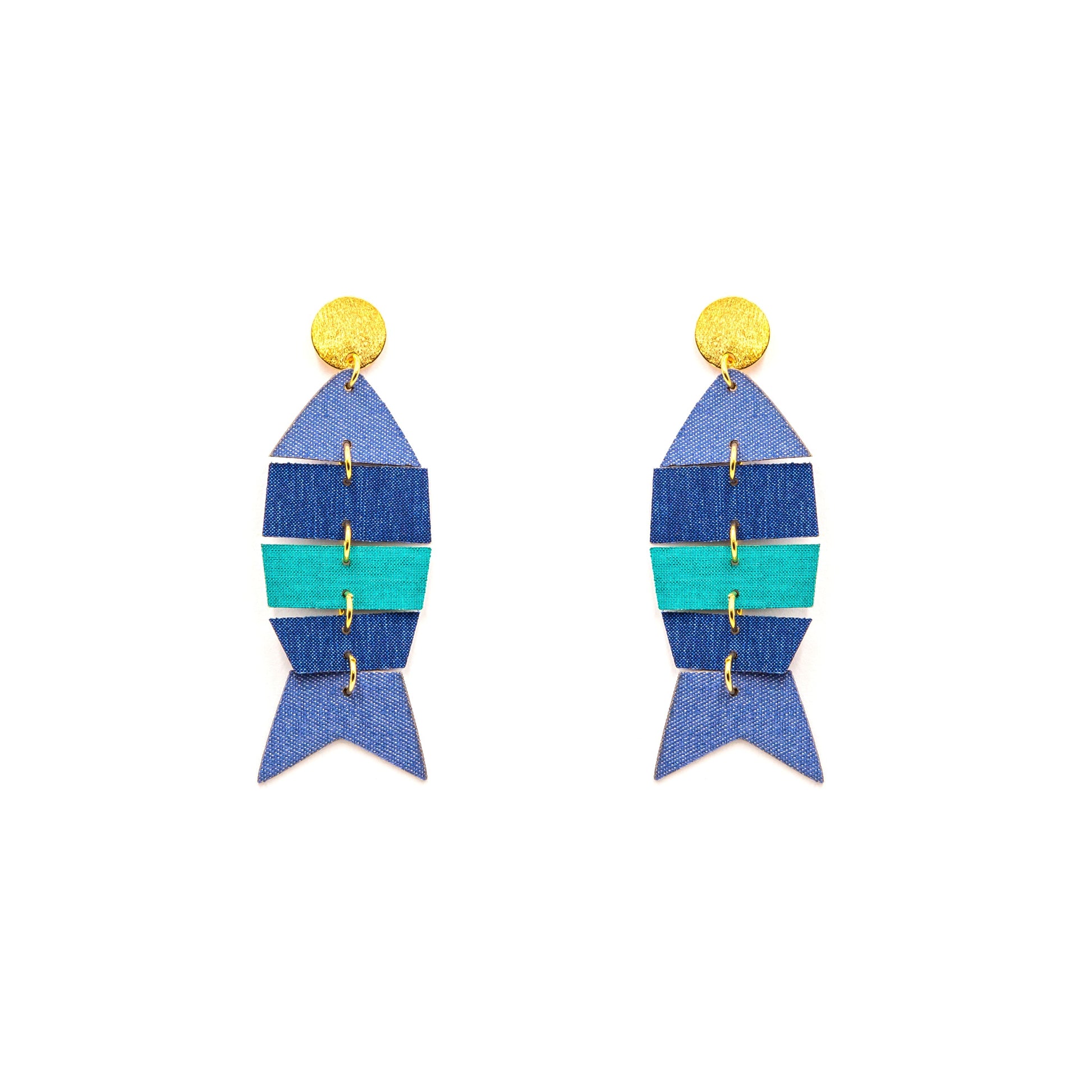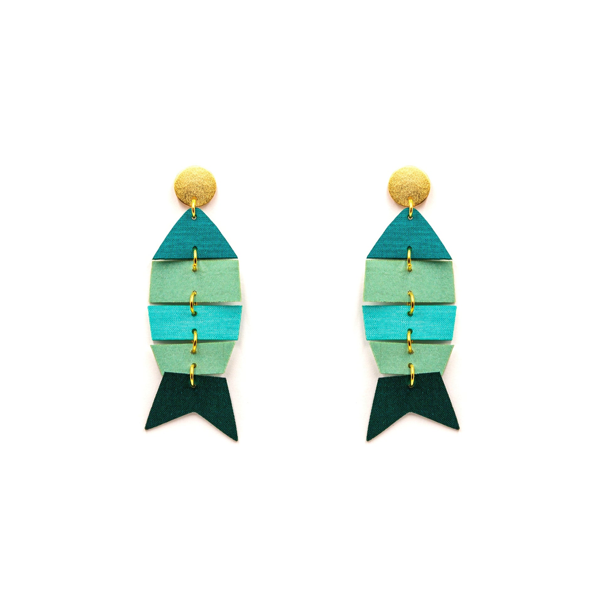 Hechos a mano a partir de recortes de textiles de diferentes tonos y texturas mate y brillante diversos colores, con diseño de figuras 3 peces y herrajes en bronce con baño en oro de 24k.