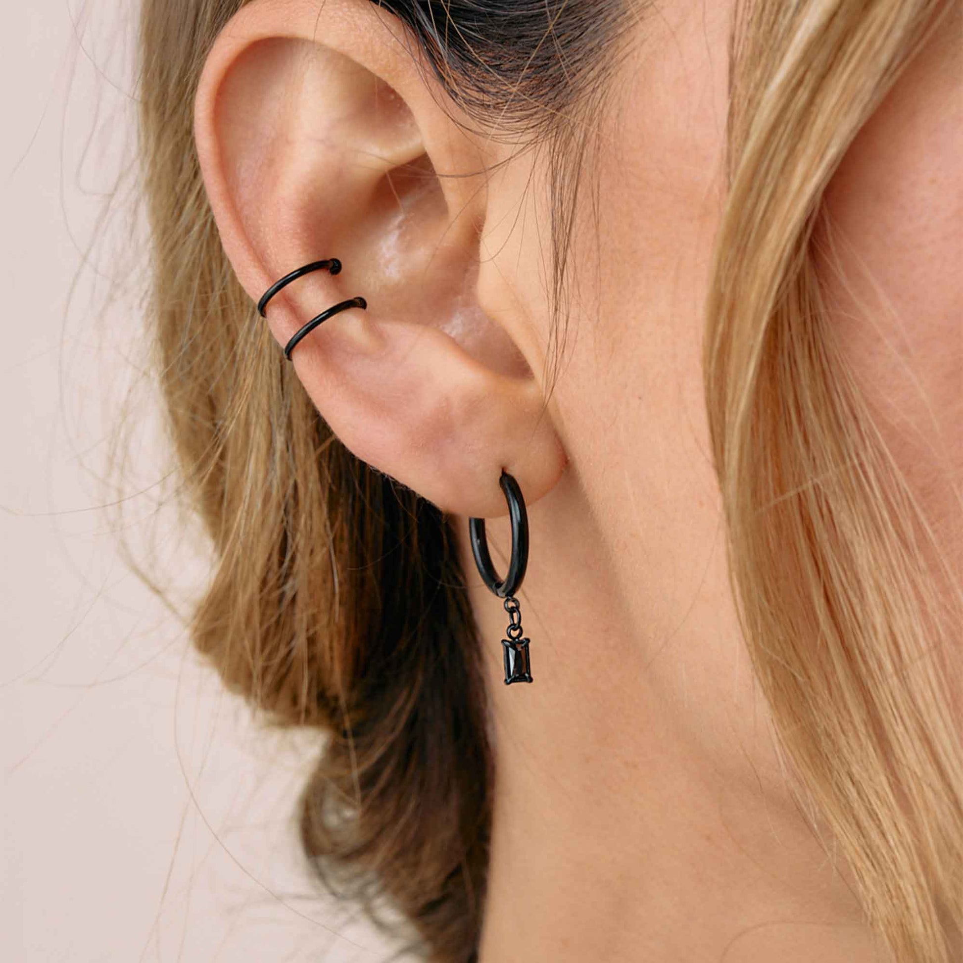 Candongas con piedra tallada en vidrio negro, elaboradas en acero quirúrgico con un proceso electroquímico que es el que le brinda el tono negro lo cual permite que la pieza sea también resistente a rayones, al agua y fricciones.