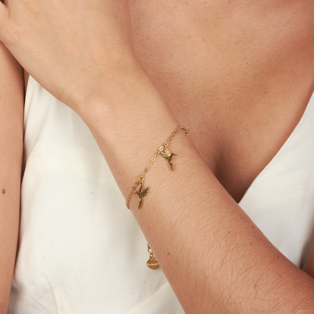 Pulsera con tres dijes de colibríe dorados vuelan contigo en esta delicada pulsera, símbolo de alegría, libertad y mensajes del alma. Una joya que te invita a brillar con ligereza y fuerza interior, Hecho en bronce con baño en plata.