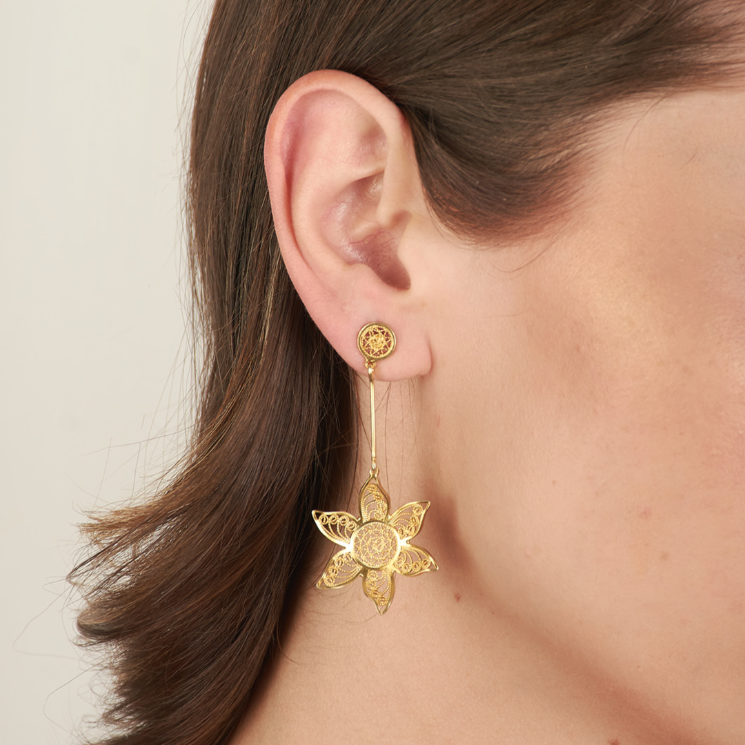 Brilla como el sol. Estos aretes en forma de girasol, elaborados a mano en Colombia con filigrana de Mompox y bañados en oro de 24k, irradian alegría, luz y sofisticación en cada detalle.