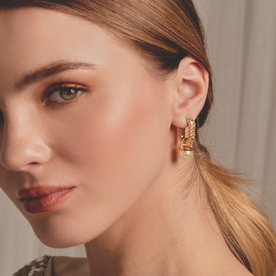 Estas candongas combinan brillo y elegancia con cristales deslumbrantes y un dije de perla removible que te permite cambiar tu estilo según tu ánimo. Perfectas para darle un toque sofisticado a cualquier look, estrella en oro o plata, diseñados con una cadena única que cae suavemente. Perfectos para quienes buscan un toque de magia en su look diario, combinan elegancia con un look cautivador.Elaborados en bronce con baño en oro de 24K.