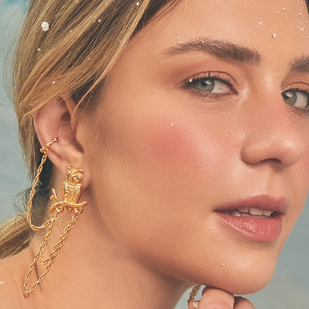 Estos aretes búho son una propuesta audaz y diferente. Cada pieza cuenta con un diseño detallado que captura la esencia mística de estas aves nocturnas. Lo que los hace especiales es el earcuff conectado por una delicada cadena, creando un efecto único.