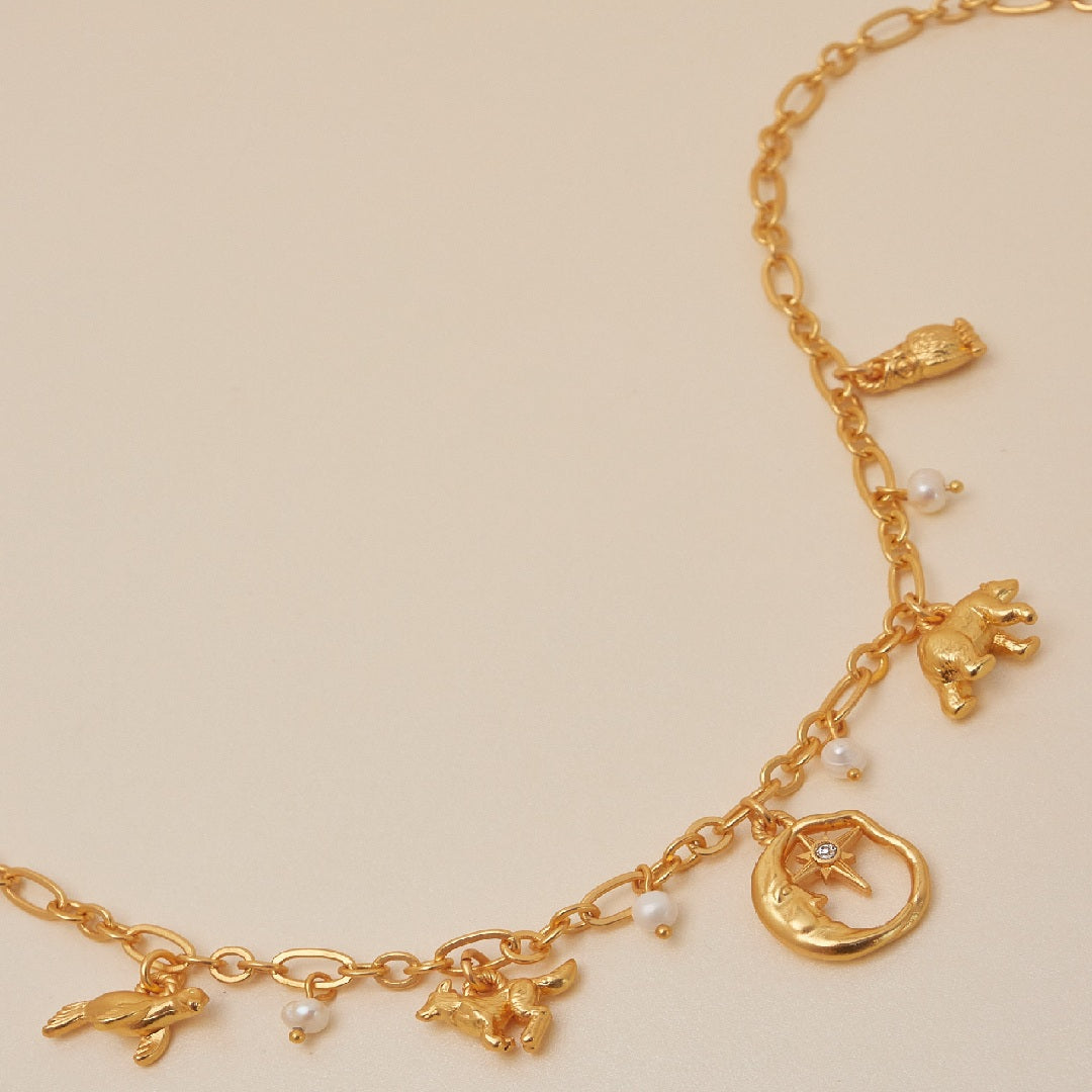 Set Snow ,un collar versátil adornado con charms que capturan la esencia de la naturaleza invernal. Cada pieza cuenta una historia desde la tierna foca y el majestuoso oso polar hasta la mística luna, el noble lobo y el sabio búho y pequeña perlas naturales, elaborado en bronce con baño en oro de 24K.