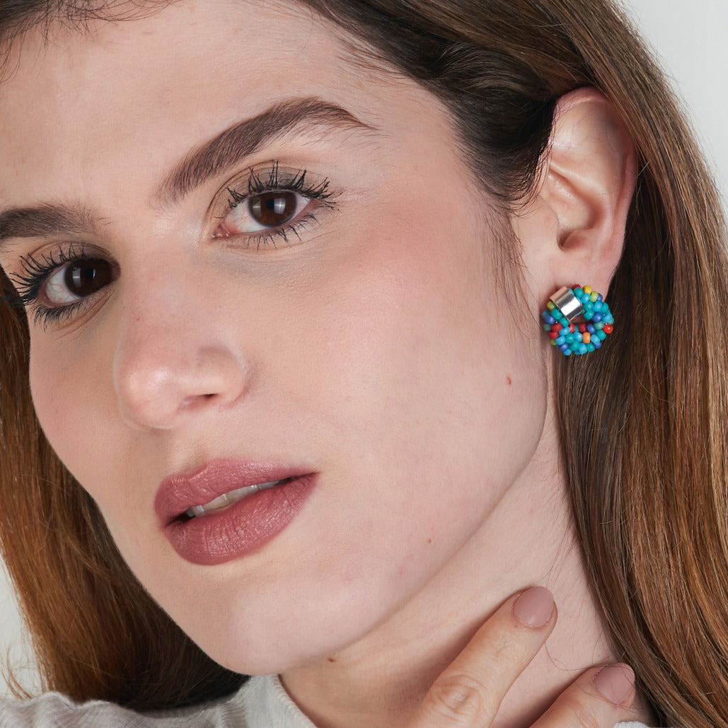 Topos tejidos son perfectos para usar todos los días. Están hechos en plata satinada 925 y ensamblados con un tejido anudado con chaquiras checas.