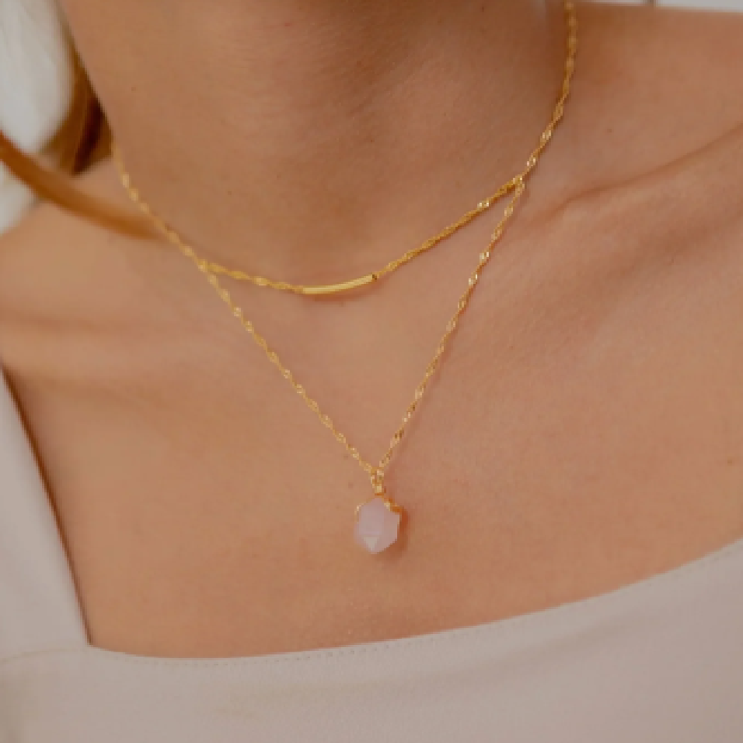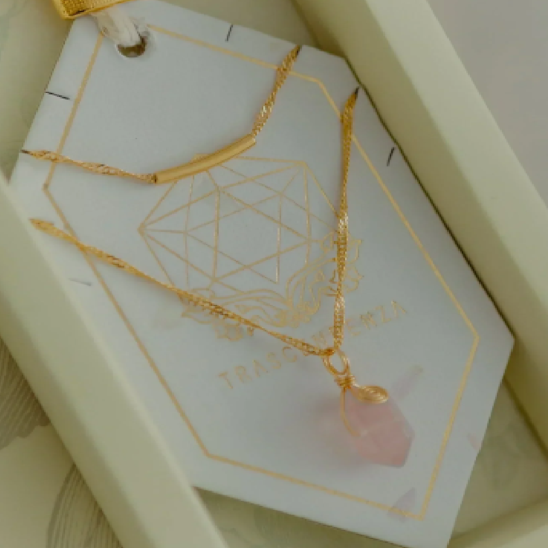 Collar elaborado en bronce con baño en oro de 24k, dije en piedra natural facetada de cuarzo rosado. Las frecuencias del cuarzo rosado nos invitan a practicar el amor propio y a tratarnos con gentileza y compasión.