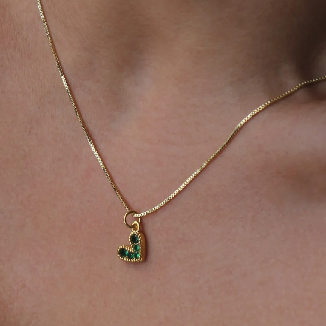 Collar dorado con dije en forma de corazón verde esmeralda. Al finalizar la extensión encontrará una llave. Hecho en bronce con baño de oro de 24k y cristales verdes.